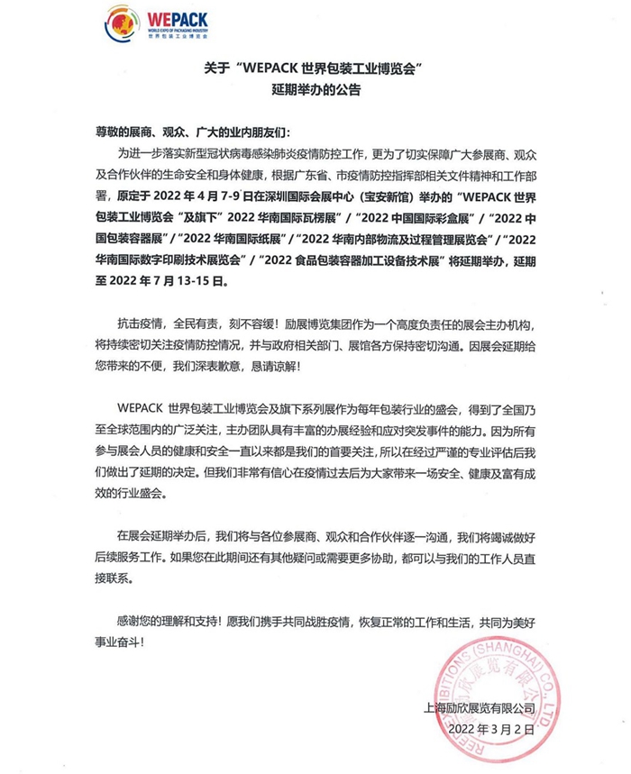 - 關(guān)于世界包裝工業(yè)博覽會(huì)WEPACK延期舉辦的公告