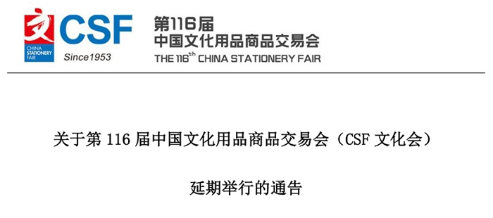 近期以來,我國新冠疫情發生頻次明顯增加,感染人數快速增長,呈現多點發生的態勢,特別是上海的疫情防控形勢極為嚴峻。為保障廣大參展商和觀眾參會的安全和效果,主辦方在經過謹慎考量及與相關各方溝通后決定,原定于2022年5月30日-6月1日在上海新國際博覽中心召開的第116屆中國文化用品商品交易會(CSF文化會)將延期舉行。