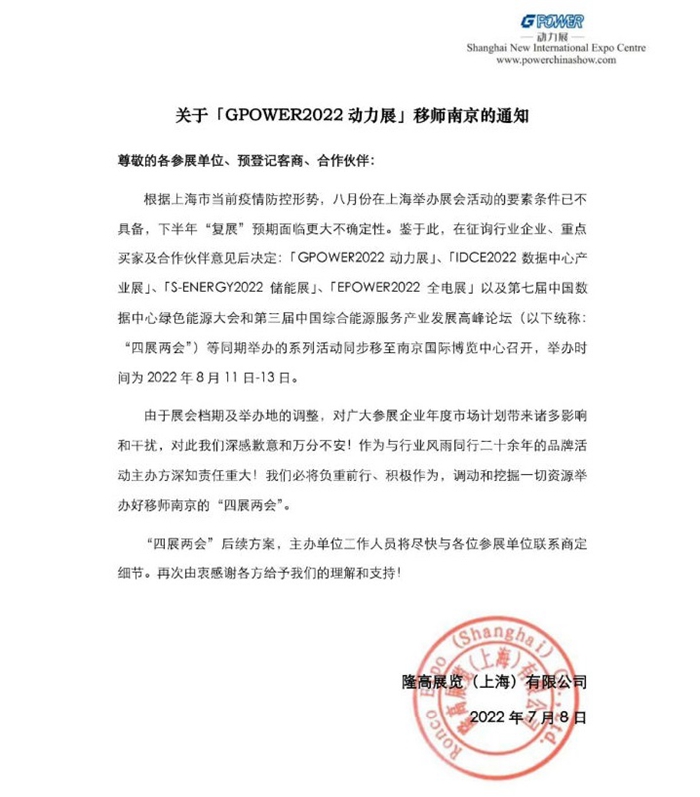 根據(jù)上海市當前疫情防控形勢,八月份在上海舉辦展會活動的要素條件已不具備,下半年“復展”預期面臨更大不確定性。鑒于此,在征詢行業(yè)企業(yè)、重點買家及合作伙伴意見后決定,GPOWER 2022中國動力展、S-ENERGY 2022中國儲能展、EPOWER 2022中國全電展等同期舉辦的系列活動同步移至南京國際博覽中心召開,舉辦時間為2022年8月11日-13日。